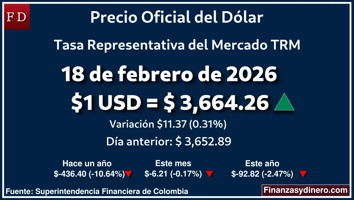 TRM hoy en Colombia 17 de febrero de 2026: $1 USD = $ 3,652.89. Comparativo mensual, anual e interanual según Finanzasydinero.com. Fuente: Superintendencia Financiera de Colombia