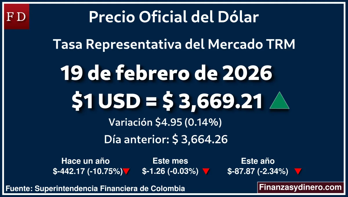 TRM hoy en Colombia 19 de febrero de 2026: $1 USD = $ 3,669.21. Comparativo mensual, anual e interanual según Finanzasydinero.com. Fuente: Superintendencia Financiera de Colombia