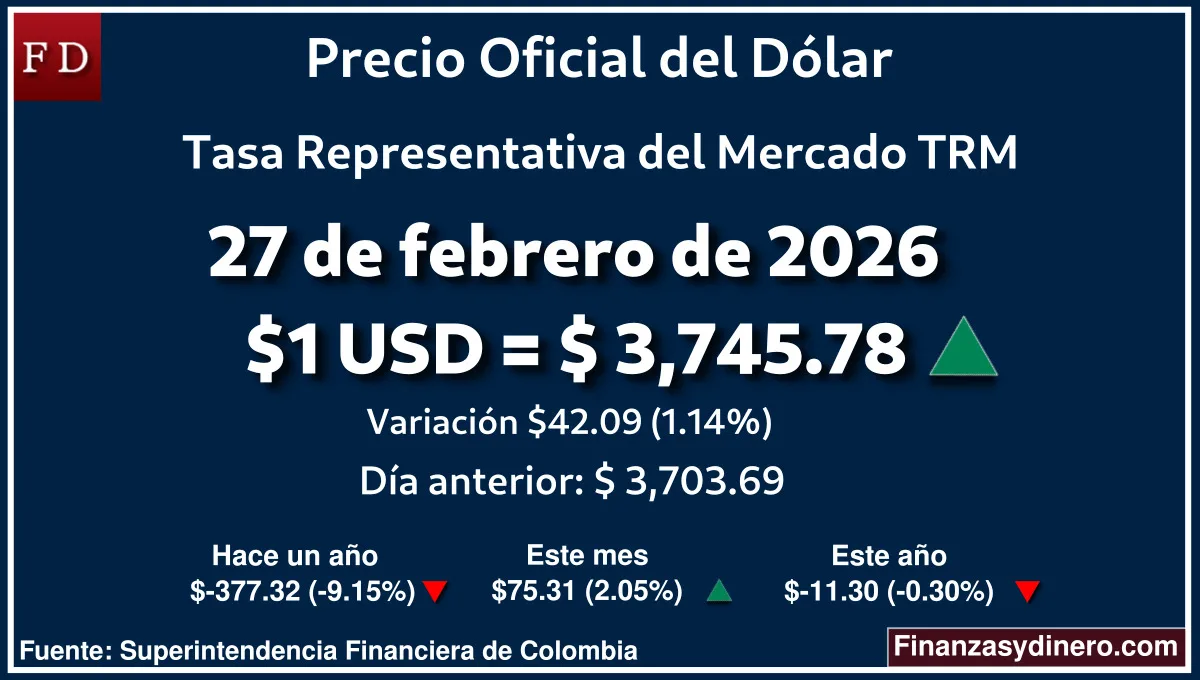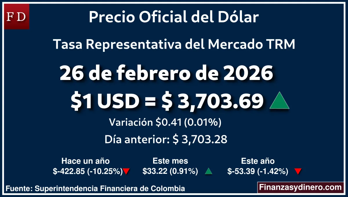 TRM hoy en Colombia 26 de febrero de 2026: $1 USD = $ 3,703.69. Comparativo mensual, anual e interanual según Finanzasydinero.com. Fuente: Superintendencia Financiera de Colombia