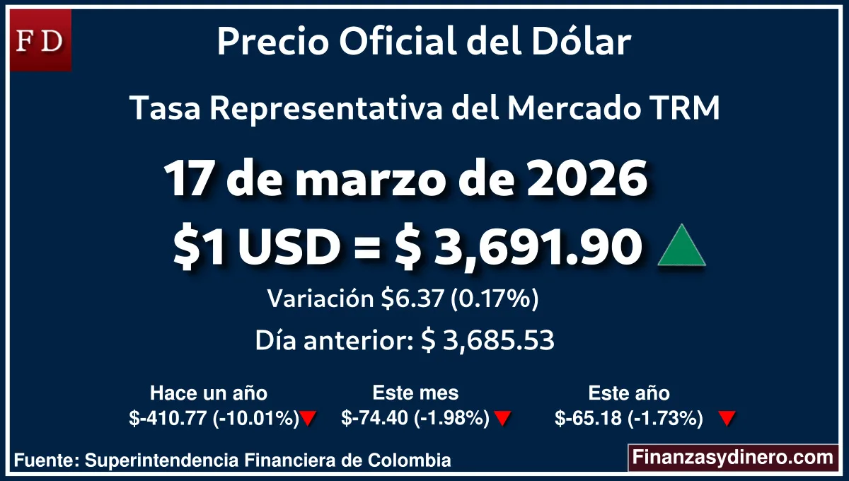TRM hoy en Colombia 17 de marzo de 2026: $1 USD = $ 3,691.90. Comparativo mensual, anual e interanual según Finanzasydinero.com. Fuente: Superintendencia Financiera de Colombia
