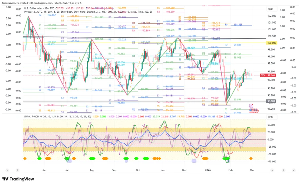 El DXY cierra una semana de perdidas y permanece en la parte media del rango 95.80-100.00 Siguiente soporte importante 95.80