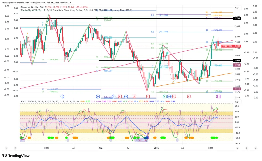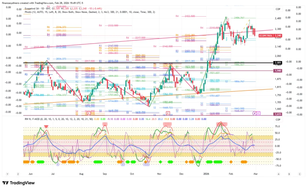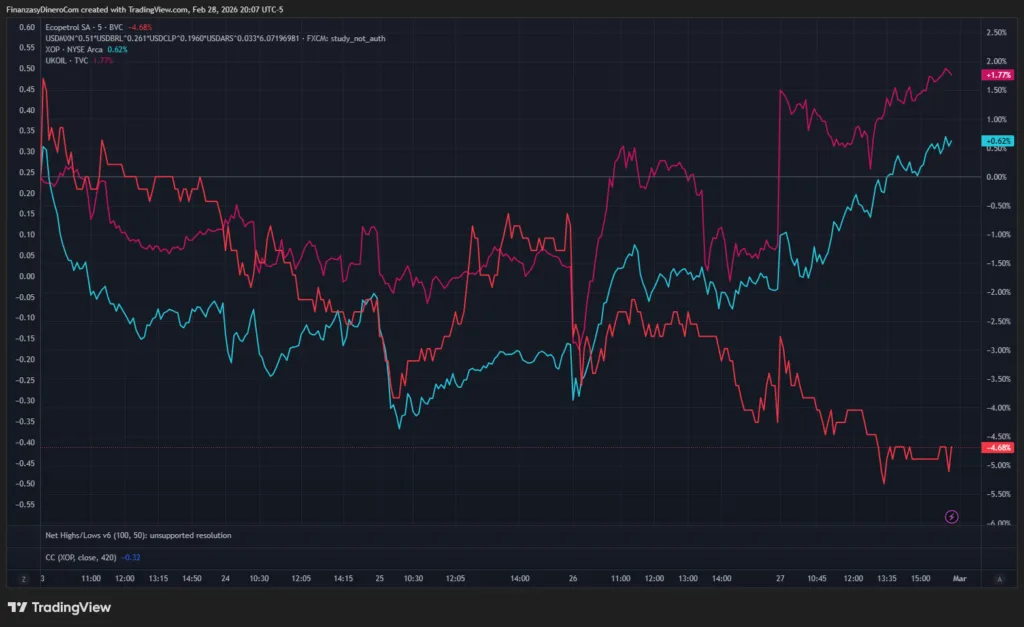 Ecopetrol (Colombia): Semana de pérdidas, altamente correlacionada con el precio del Brent y el ETF XOP. Su comportamiento inmediato estará directamente atado a la evolución del conflicto petrolero/geopolítico internacional.
