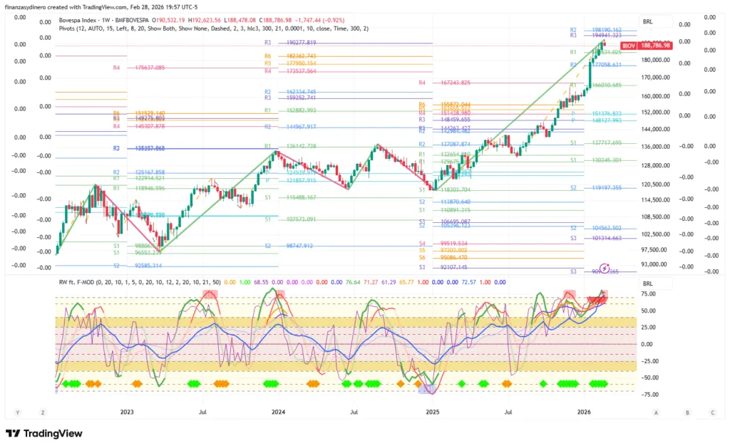 Brasil (BOVESPA): Aunque marcó un nuevo máximo histórico, cerró la semana con pérdidas. Tiene extrema sobrecompra mensual y semanal, con alta probabilidad de una fuerte corrección.