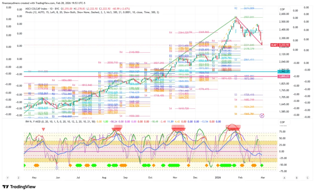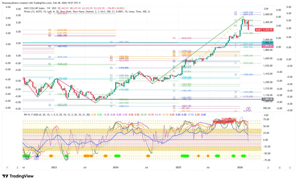 Colombia (MSCI COLCAP): Fuertes pérdidas (soporte en 2,221), fuertemente lastrado por el clima electoral y las tensiones binacionales con Ecuador. Persiste el riesgo de una caída mayor hasta los 1,942, aunque algunas acciones individuales en sobreventa podrían amortiguar el golpe.