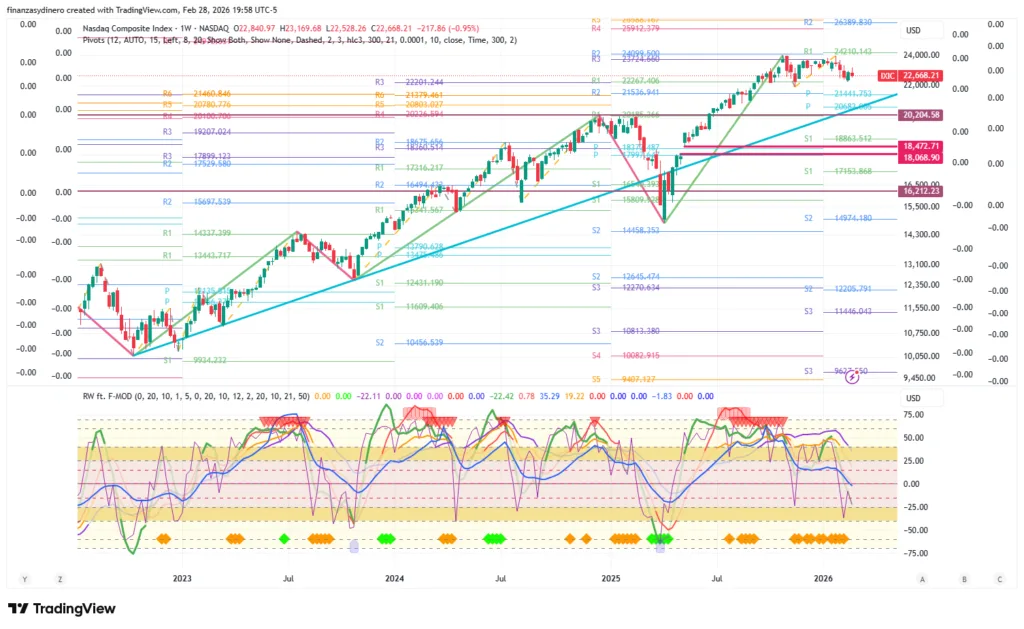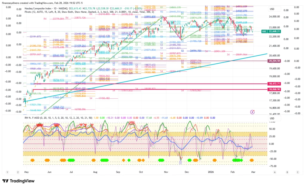 Estados Unidos (S&P 500 y NASDAQ): Ambos índices cerraron a la baja y enfrentan riesgos significativos de caídas severas (objetivo 6,147 para el S&P y 20,204 para el NASDAQ) debido a las alarmas geopolíticas en Medio Oriente. La volatilidad está comprimida, por lo que se avecinan movimientos muy bruscos en los próximos días.
