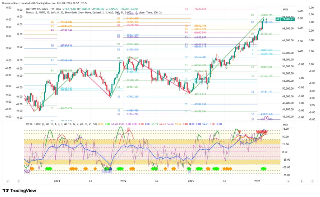 México (IPC): Pérdidas marginales e indecisión. Presenta un nivel de sobrecompra extrema semanal con un soporte clave en 70,184.
