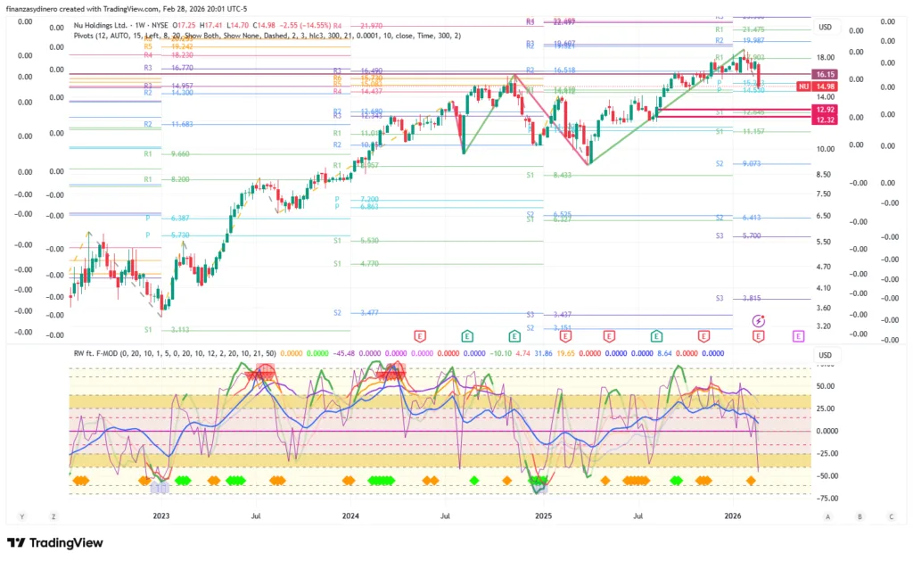 NU Holdings (EE. UU./Brasil): Fuertes pérdidas rompiendo soportes tras presentar resultados. Factores geopolíticos podrían hundir más el precio hasta intentar cerrar el hueco (gap) situado entre los $12.32 y $12.92.