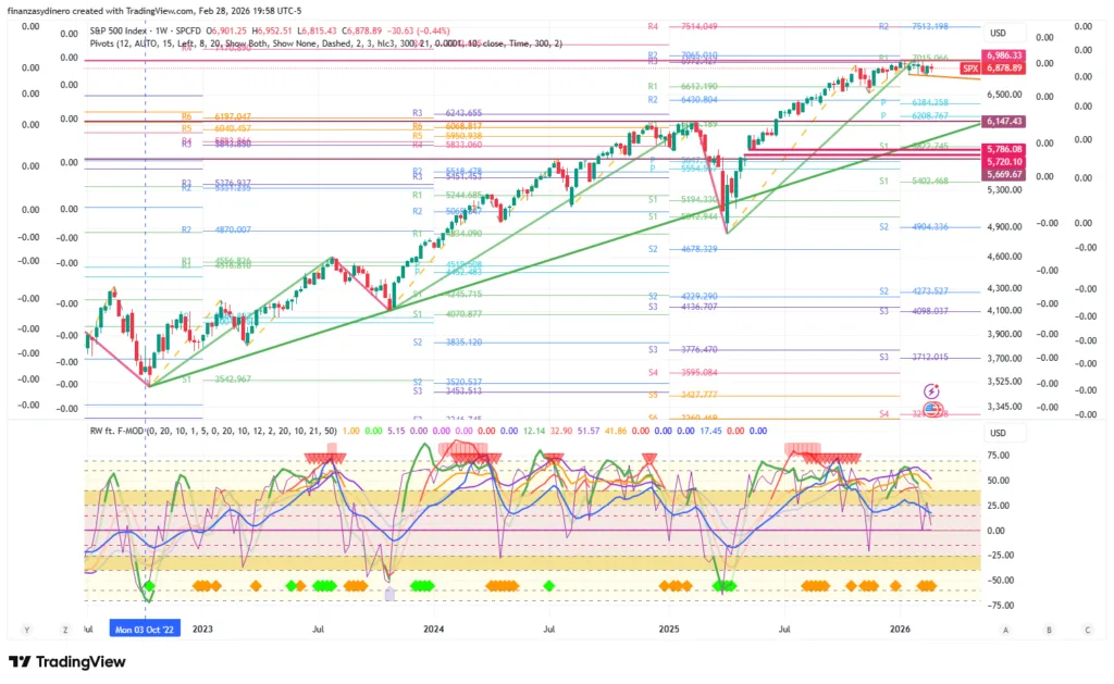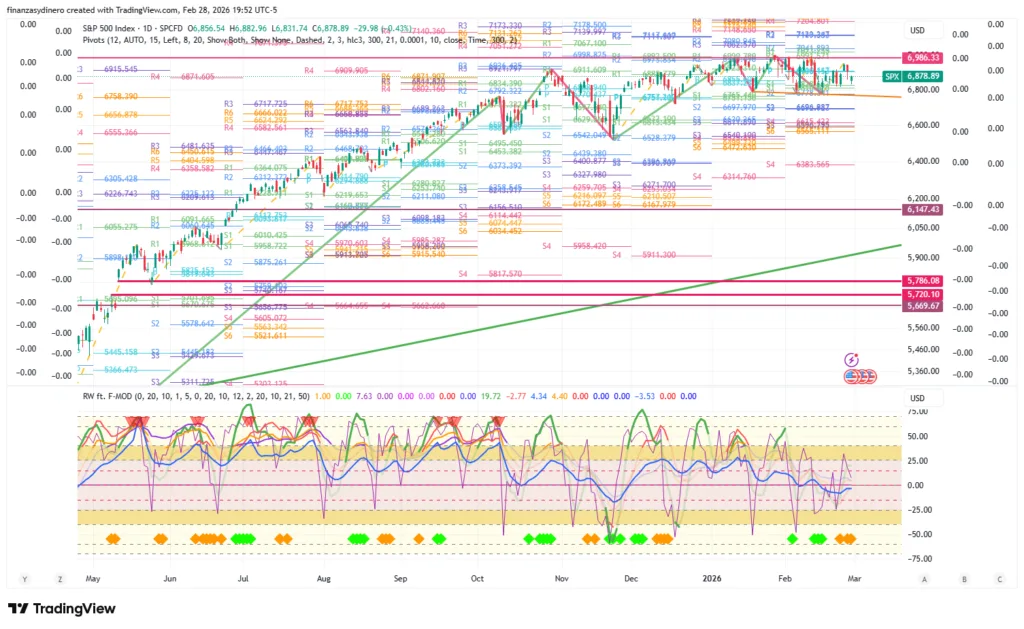 Cierra una semana de perdidas y encuentra soporte en la zona 6,810-6,828. El soporte dado por la línea de tendencia de corto plazo del 10 de octubre’25 y 7 de noviembre’25 se convierte en el punto de referencia, luego de los históricos eventos que se han presentado en las ultimas horas en el Medio Oriente con el inicio de la guerra entre Israel, Estados Unidos versus Irán. Esto aumenta el riesgo en los mercados y, hasta el momento, se espera una reacción negativa.