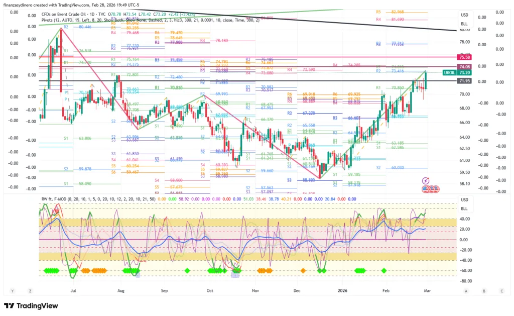 Petróleo Brent: Semana ganadora y con volatilidad histórica. Los graves eventos en Medio Oriente (ataque de EE. UU. e Israel a Irán) amenazan con un fuerte salto alcista (gap de apertura) llevándolo hacia los 80-90 por barril. Esto contrasta con el aumento de producción pactado por la OPEP+ y las negociaciones latentes entre Rusia y Ucrania.