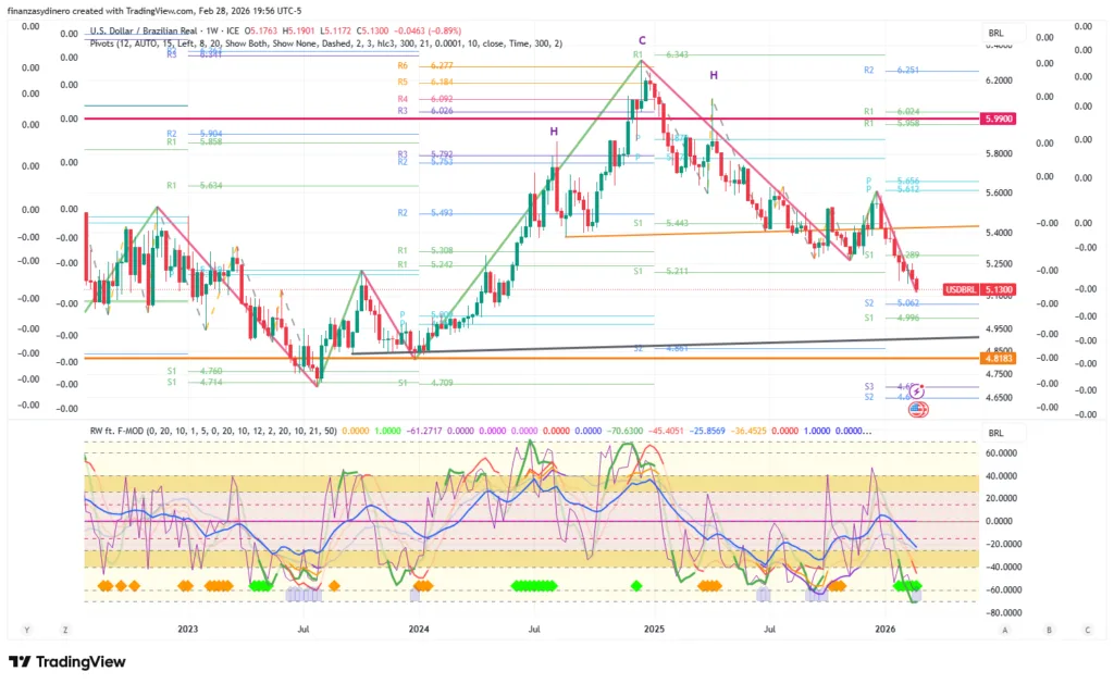 Brasil (USD/BRL): Registró pérdidas y marcó un nuevo mínimo para 2026. El par está por debajo del cuello de un patrón Hombro-Cabeza-Hombro (HCH) con un objetivo bajista de $4.4732.