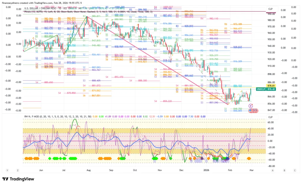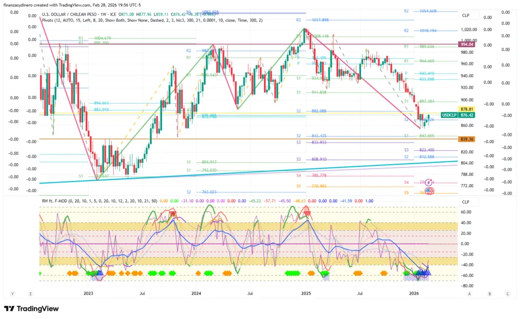 Chile (USD/CLP): Semana de ganancias acercándose a la resistencia de los $871. Aunque el cobre intenta recuperarse hacia máximos históricos, hay riesgos de que su rally haya terminado, lo que perjudicaría al peso chileno. A nivel mensual y semanal se encuentra sobrevendido.