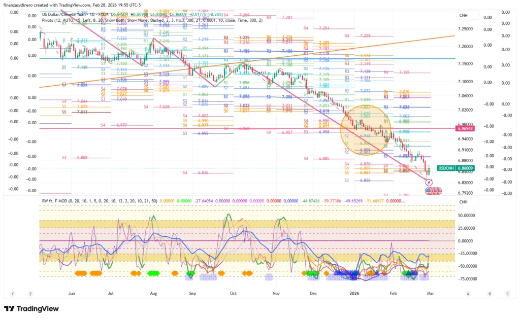 China (USD/CNH): Fuertes pérdidas para el dólar frente al yuan, alcanzando mínimos no vistos desde 2023. Sin embargo, su extrema sobreventa y una vela de cola larga indican una muy posible y pronta corrección alcista hacia los 7.07.