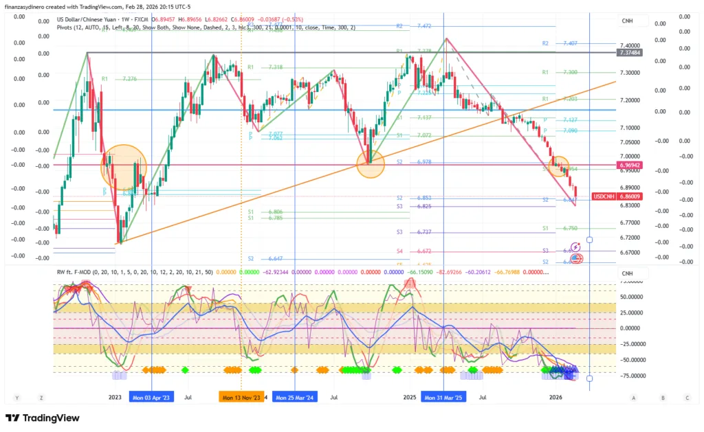 Cierra una semana de fuertes perdidas y alcanza niveles que no se veían desde marzo de 2023. Encuentra soporte en el nivel S2 6.84. El siguiente objetivo es la zona 6.75/6.80.
