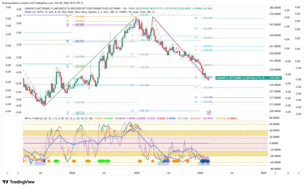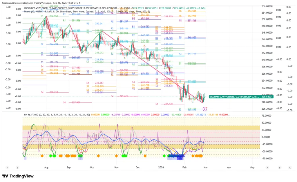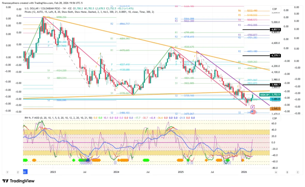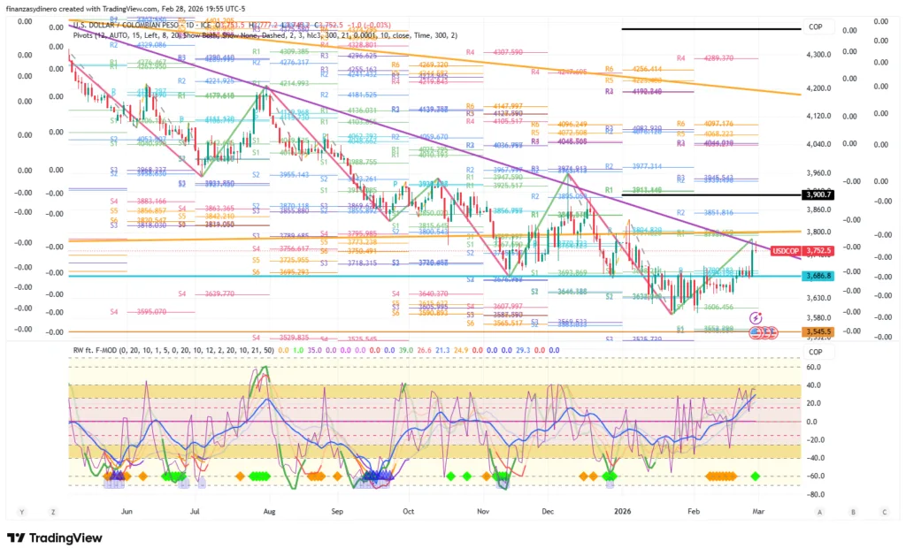 Colombia (USD/COP): El dólar cerró con ganancias, probando la tendencia bajista y dejando una vela doji (indecisión). El peso enfrenta presiones encontradas: el alza del crudo lo beneficia, pero el riesgo global, la guerra comercial con Ecuador y la incertidumbre por las elecciones legislativas del 8 de marzo lo debilitan. Resistencia clave: $3,800.