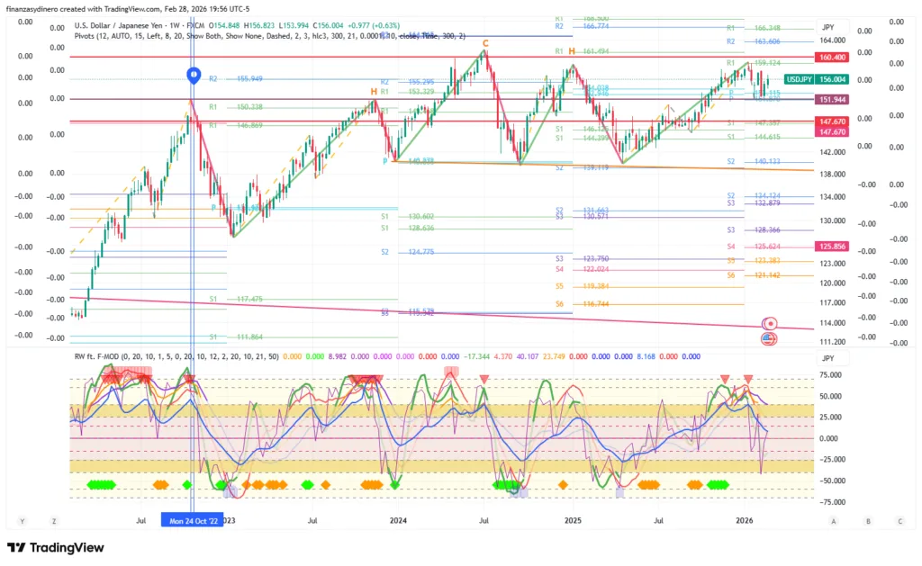 Japón (USD/JPY): El yen ganó terreno en la semana. El soporte crítico está en la zona de 151.94-153.11; de romperse, caería a 147.67.