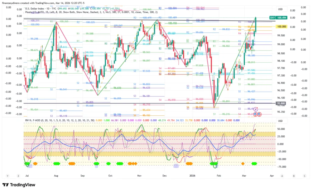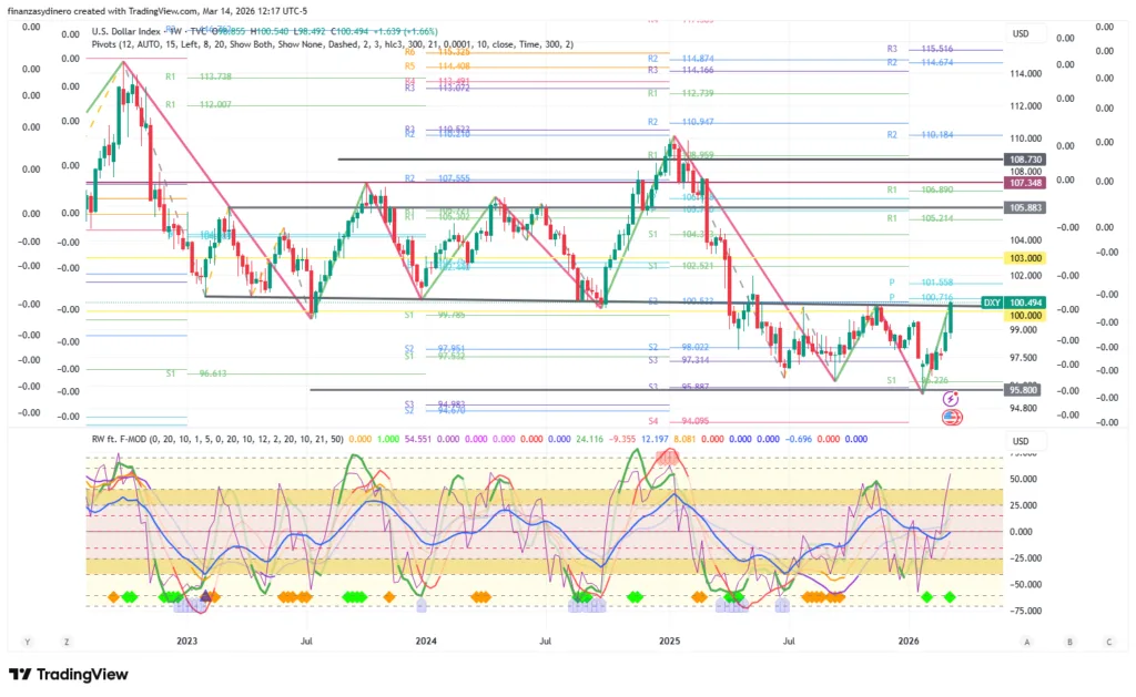 El DXY cierra una semana de fuertes ganancias y supera el techo del rango 95.80-100.00. Ahora tiene como resistencia la zona de pivotes anuales 100.71-101.55