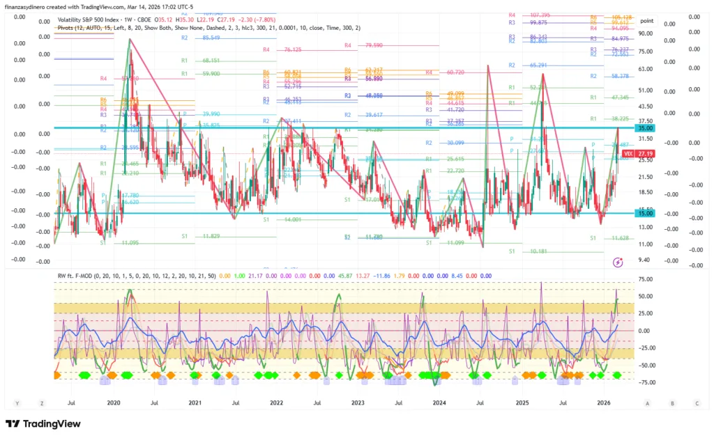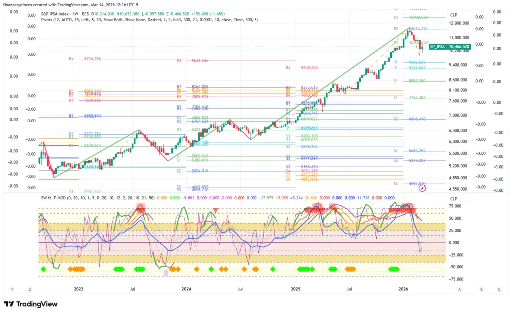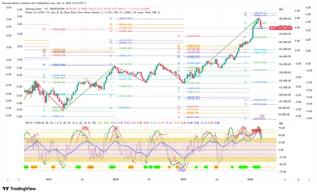 Tanto a nivel semanal como mensual esta en sobrecompra extrema y esto indica que una alta probabilidad de corrección, en especial si tenemos el buen desempeño que se presento en 2025 y el excepcional desempeño en lo que va de 2026.