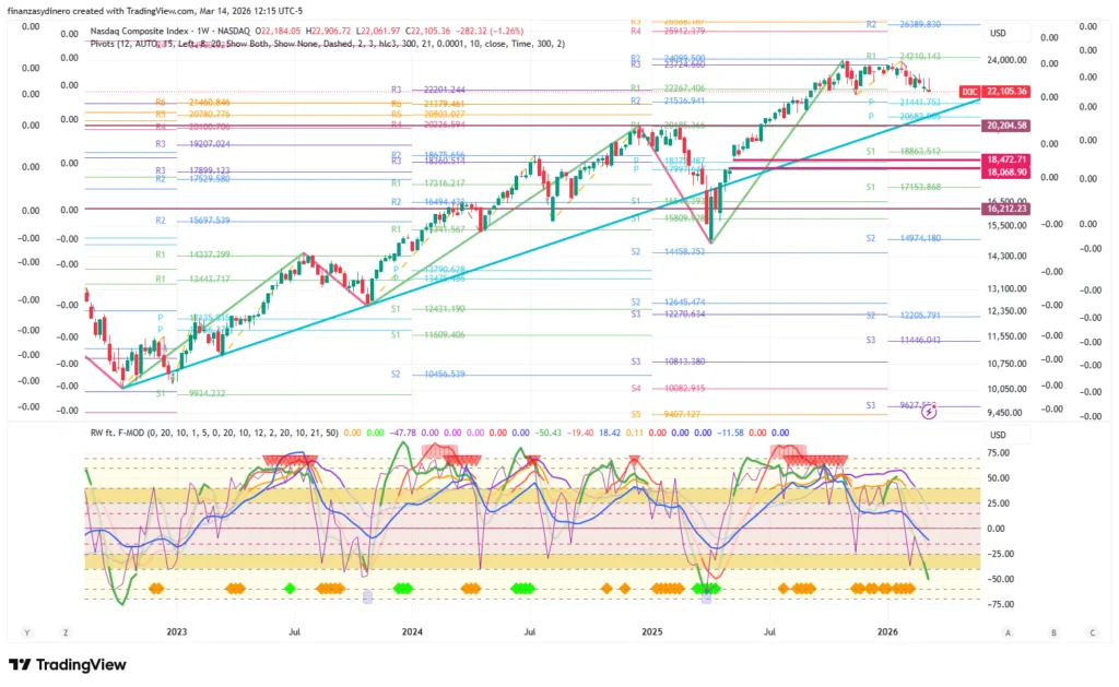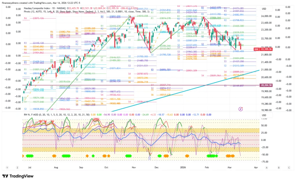 Cierra una semana de perdidas. El mercado presenta un alto riesgo de una corrección bajista hacia los 20,204, en especial teniendo en cuenta los eventos geopolíticos en Medio Oriente y los efectos de la burbuja AI, tanto en otros sectores tecnológicos, como en la financiaron «circular» y su relaciona con el crédito/capital privado.