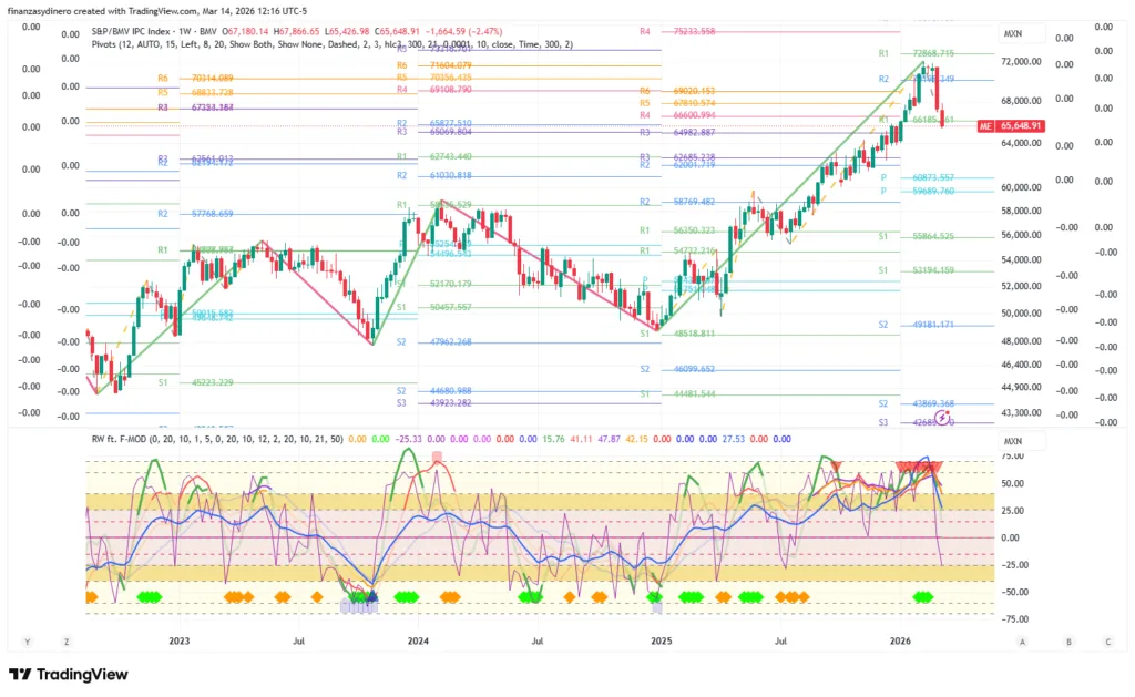 Cierra una semana de fuertes perdidas resultado del incremento en el riesgo a nivel mundial. Supera el soporte dado por los 66,185. Al alza objetivo 72,868.