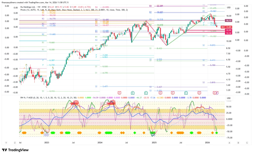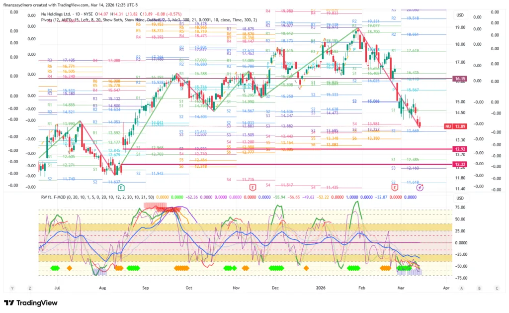 Cierra una semana de perdidas y rompe el soporte dado por los pivotes anuales abriendo la puerta a probar el gap $12.32-$12.92. Factores de mercado (geopolítica) pueden ayudar a que se cumpla este movimiento.