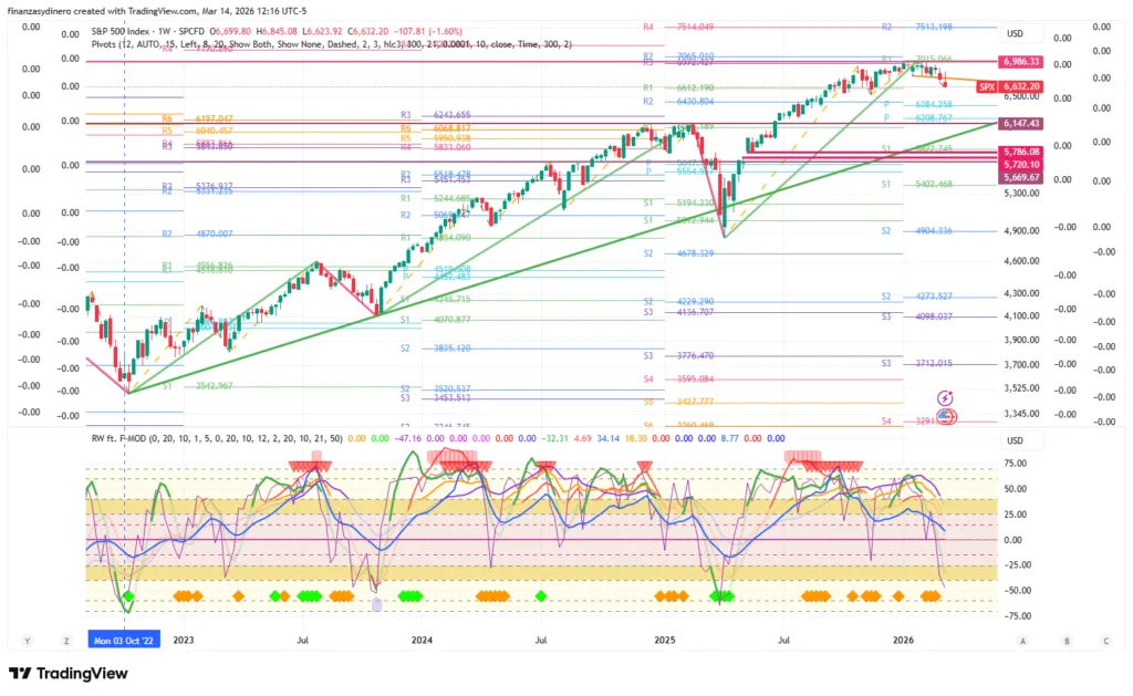 Cierra una semana de perdidas y prueba la resistencia dada por el antiguo soporte dado por la línea de tendencia de corto plazo del 10 de octubre’25 y 7 de noviembre’25. Objetivo bajista 6,384. Sin embargo en el corto plazo se pueden presentar correcciones alcistas.