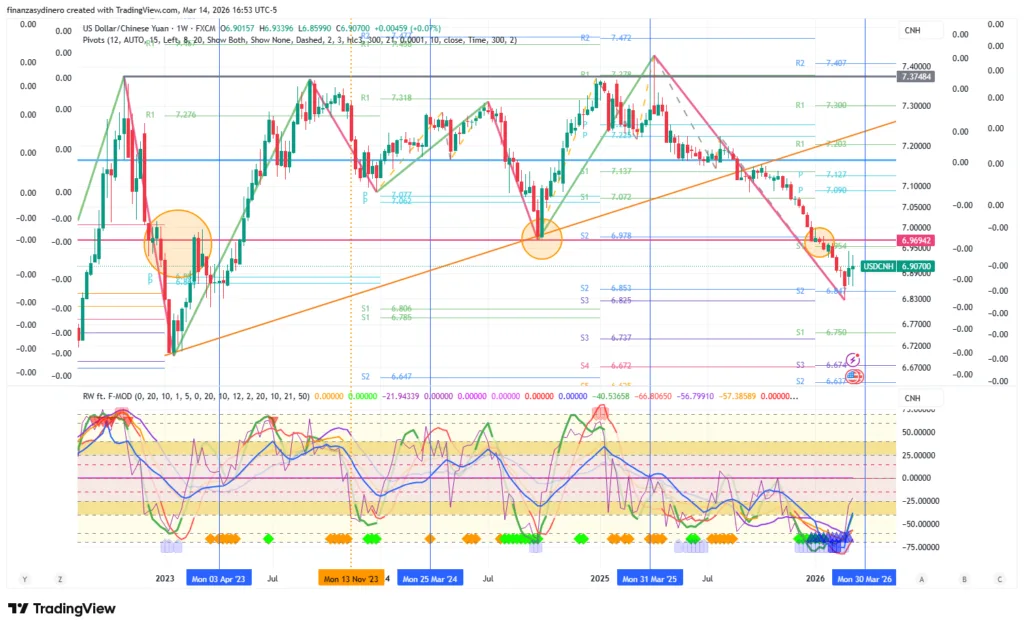 Cierra una semana de ganancias marginales y deja una vela de indecisión. A la baja soporte importante en el nivel S2 6.84. El siguiente objetivo bajista es la zona 6.75/6.80. Al alza próxima resistencia en zona 6.95-6.97
