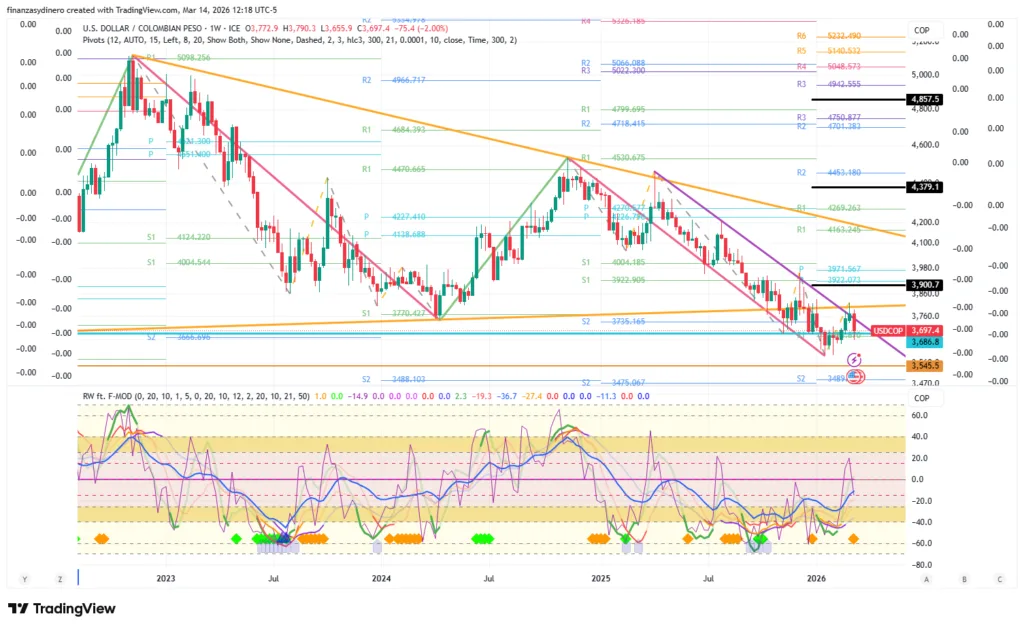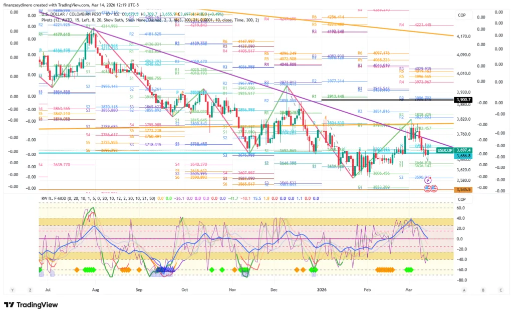 El mercado cambiario en Colombia atraviesa un periodo de reconfiguración técnica y fundamental. Durante la última semana, el par USD/COP consolidó su posición dentro de un patrón de cuña descendente, testeando niveles de soporte críticos en la zona de los $3.680. Este movimiento ocurre en un contexto de alta fricción geopolítica global, donde el fortalecimiento del peso colombiano ha desafiado la tendencia de aversión al riesgo que suele favorecer al dólar estadounidense.