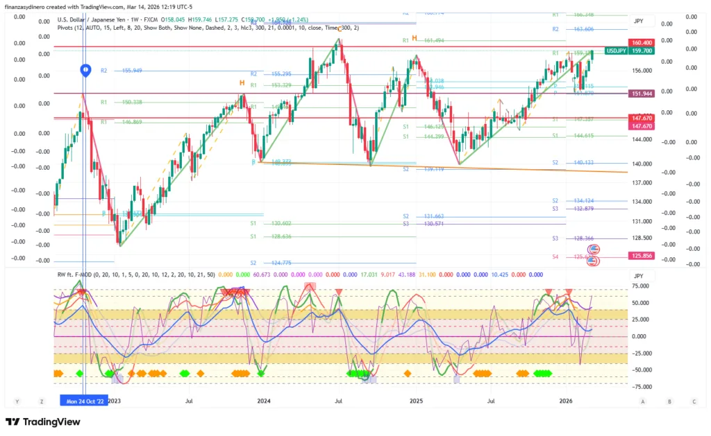 El yen cierra una semana de ganancias e ingresa a la zona de resistencia 159.12-160.40. De ser superada el siguiente objetivo seria el máximo del año 2024: 161.951.