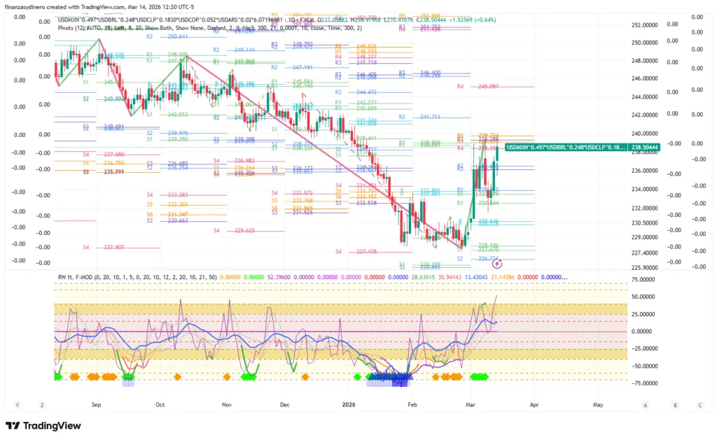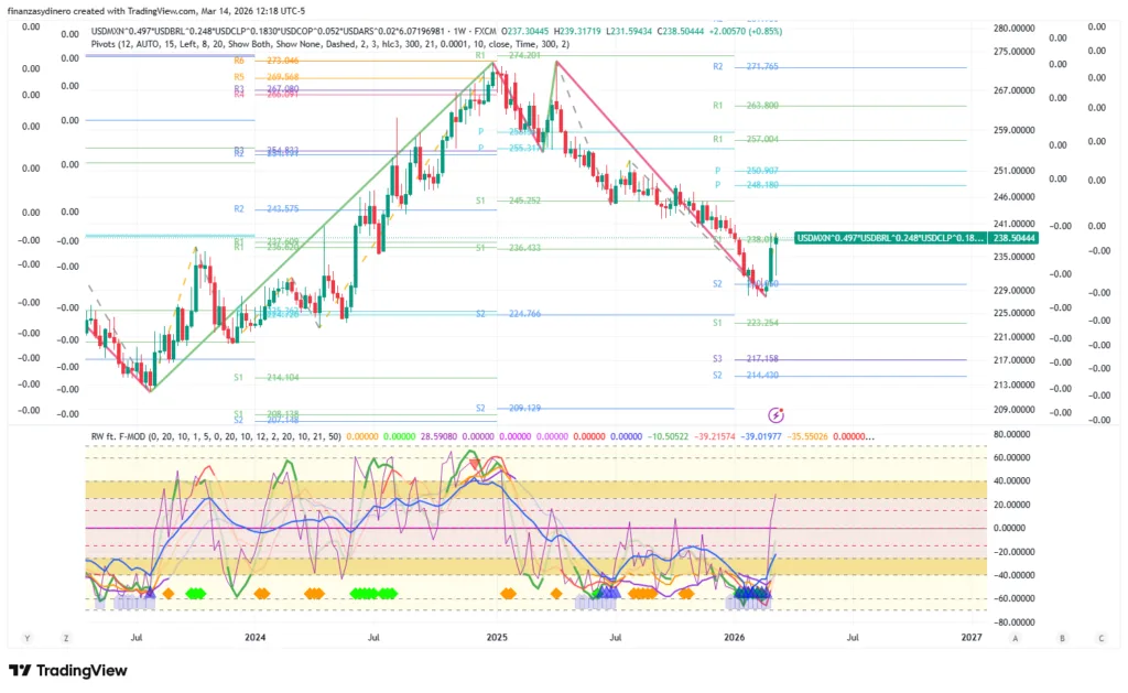 El peso colombiano lideró el fortalecimiento regional frente al dólar. En contraste, el USD/MXN en México y el USD/CLP en Chile mostraron una volatilidad elevada con sesgos alcistas para el billete verde. En Chile, el retroceso del cobre hacia el rango de $5,56 – $6,14 debilita la moneda austral, mientras que en México, el IPC sufrió pérdidas significativas por el incremento del riesgo global. El índice compuesto de monedas latinoamericanas sugiere una divergencia positiva que, de resolverse, podría implicar una depreciación promedio del 10% en la región; sin embargo, el COP mantiene un sesgo bajista a largo plazo debido a su condición de sobreventa.