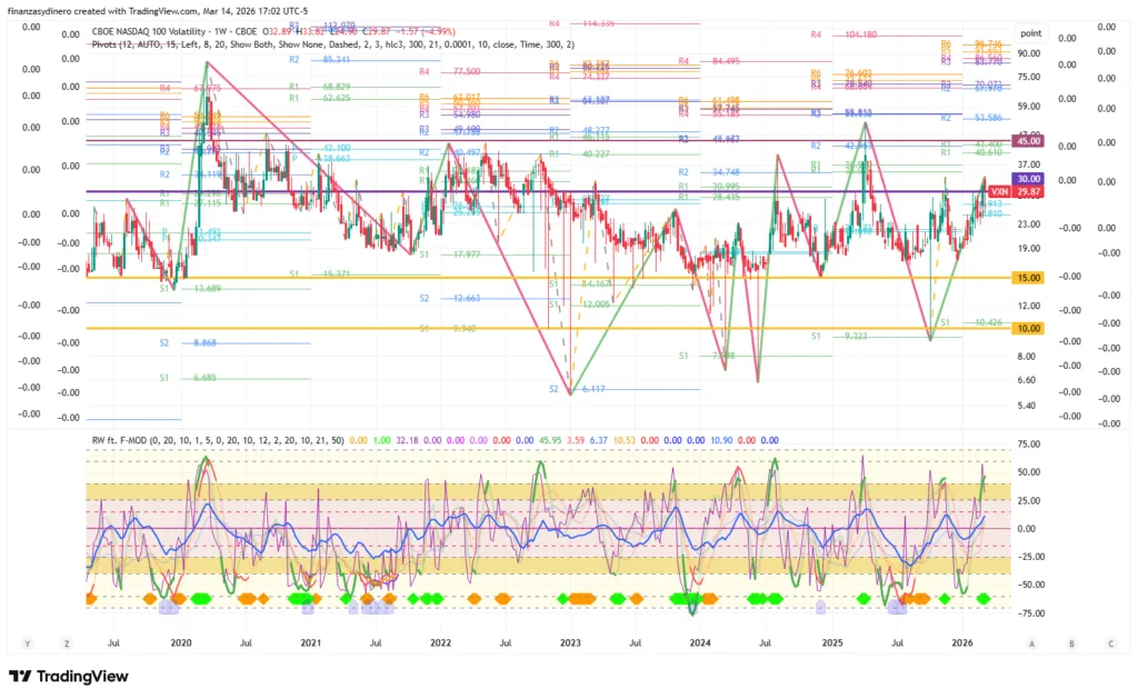 El índice de volatilidad VXN permanece cerca de la zona 30-45 que ha sido un buen indicador para iniciar compras moderadas pero aun lejos de niveles de pánico (>45).