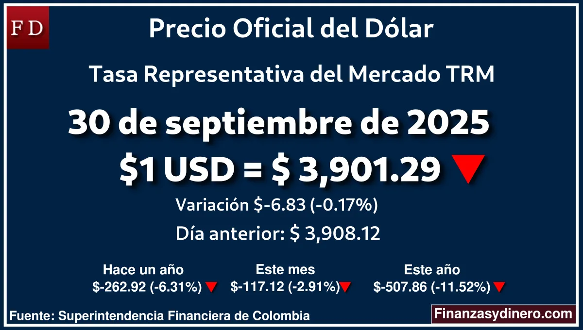 La Tasa Representativa del Mercado (TRM) en Colombia para el 30 de septiembre de 2025 se fijó en $3901.29 pesos colombianos por dólar, marcando un retroceso de $-6.83 frente al día anterior, lo que representa una variación diaria de -0.17%.
