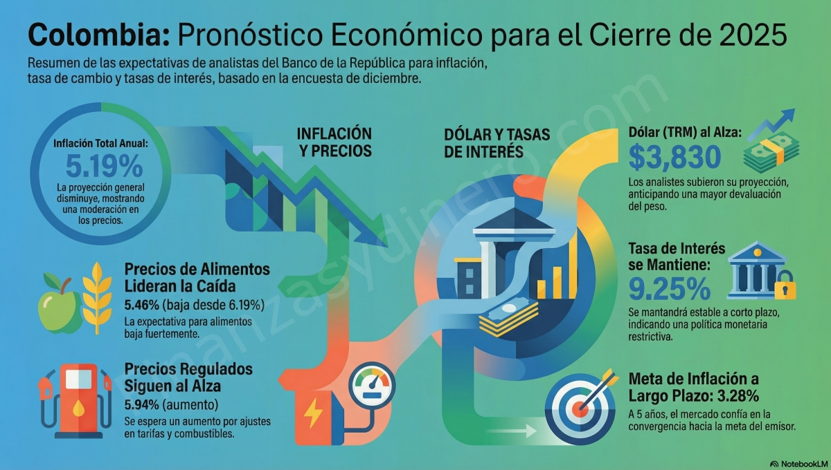 El mercado financiero colombiano ajustó sus proyecciones macroeconómicas en la última encuesta del año. Según el sondeo de diciembre de 2025 realizado por el Banco de la República, los analistas económicos prevén que la inflación anual cierre en 5.19%, una cifra inferior a lo estimado el mes anterior. Sin embargo, las expectativas sobre la tasa de cambio aumentaron, ubicando la divisa estadounidense en $3,830 pesos, mientras que las tasas de interés de intervención se mantendrían estables en 9.25% durante el corto plazo.