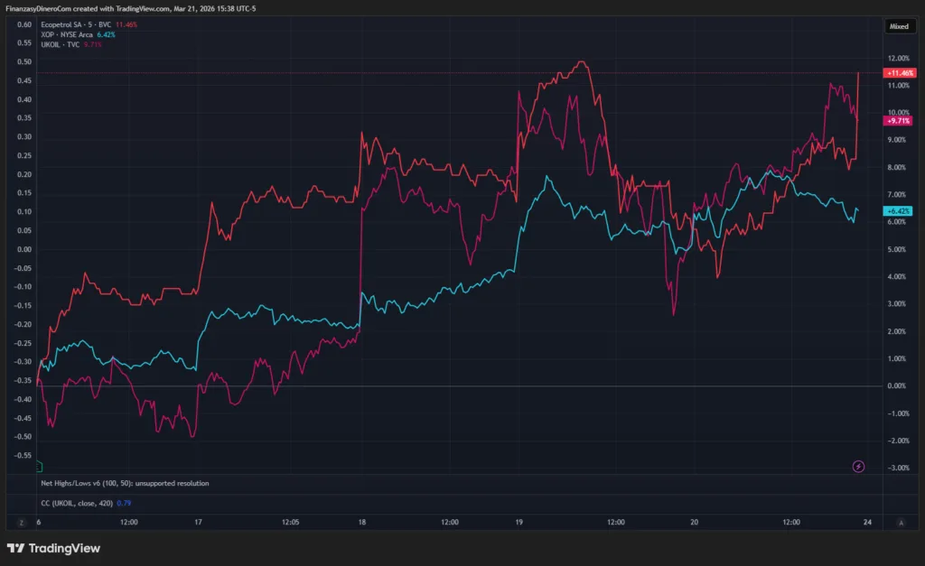Acción de Ecopetrol versus XOP y UKOIL últimos cinco días