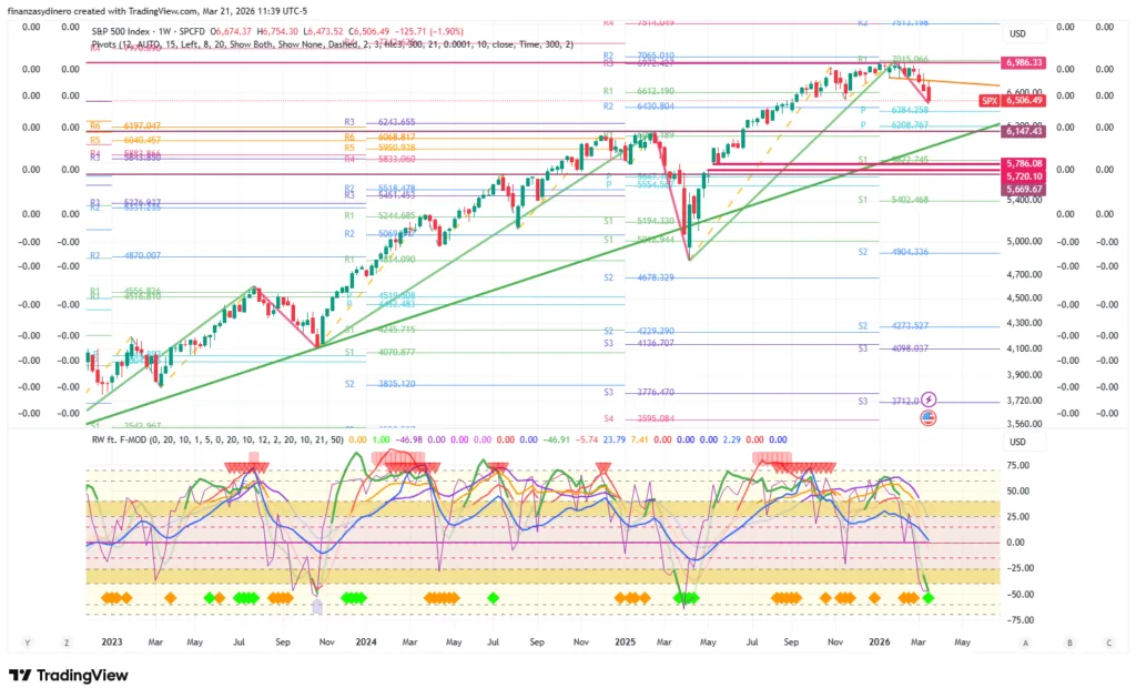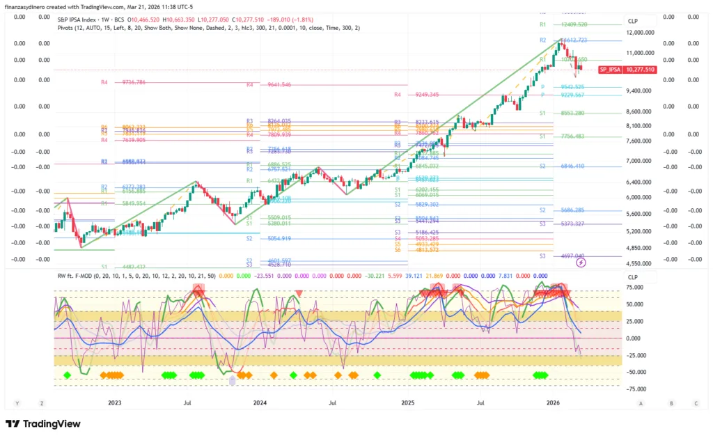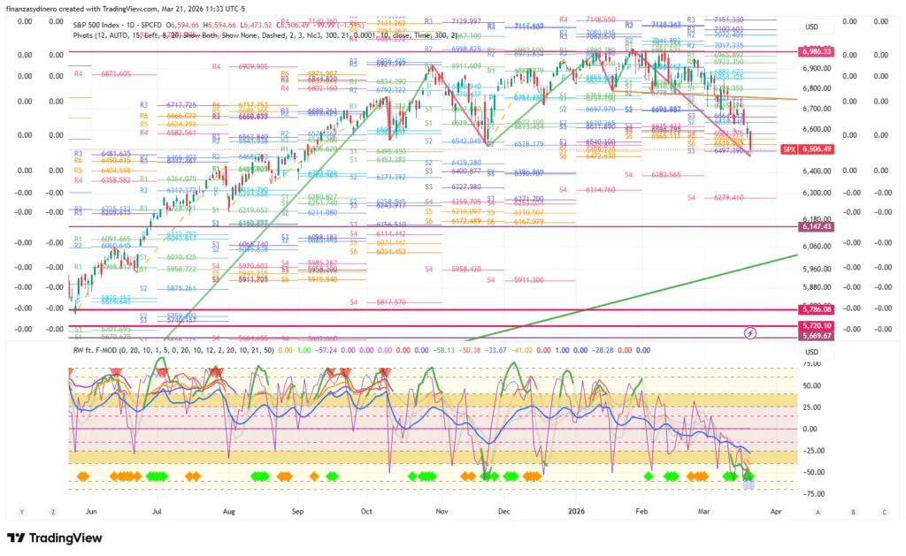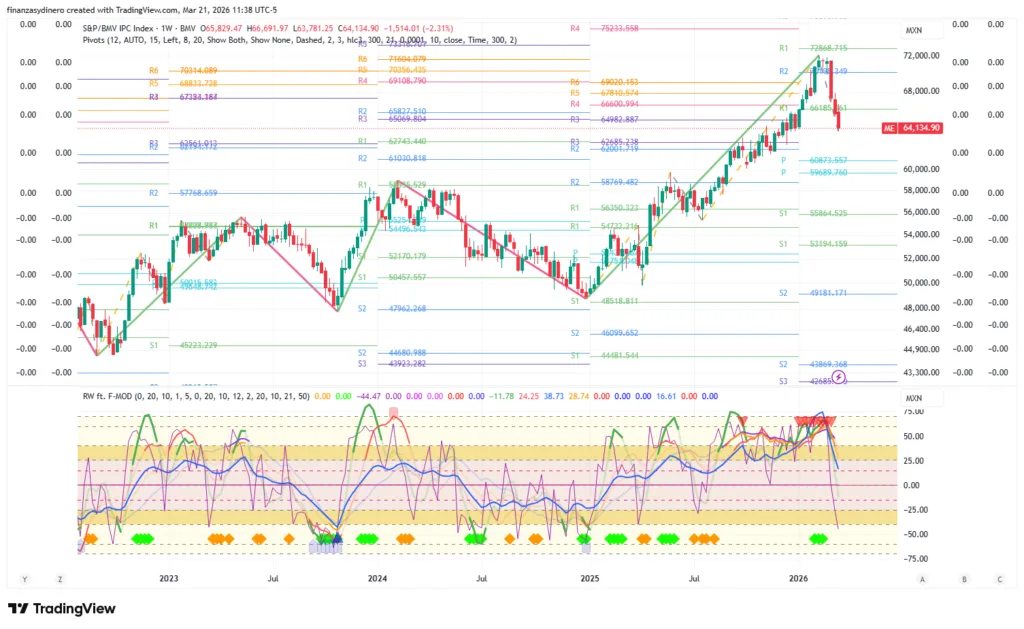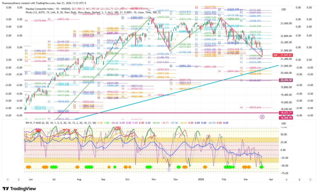 Cierra una semana de perdidas y ahora se enfrenta a la zona de pivotes anuales 20,682-21,441. El mercado presenta un alto riesgo de una corrección bajista hacia los 20,204, en especial teniendo en cuenta los eventos geopolíticos en Medio Oriente y los efectos de la burbuja AI, tanto en otros sectores tecnológicos, como en la financiaron «circular» y su relación con el crédito/capital privado.