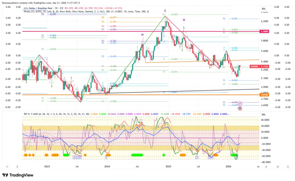 Cierra una semana de perdidas y encuentra soporte en el nivel S1. Permanece por debajo de la línea de cuello del patrón HCH que se ha mencionado en otras ocasiones. El objetivo del patrón HCH es $4.4732. Soporte inmediato en la zona $4.99-$5.06.