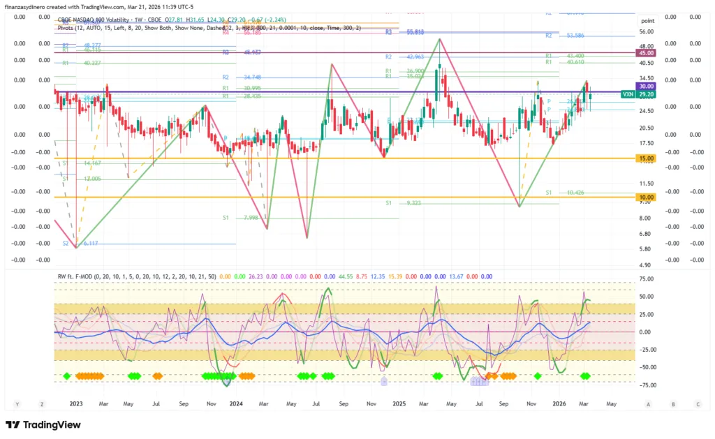 El índice de volatilidad VXN permanece cerca de la zona 30-45 que ha sido un buen indicador para iniciar compras moderadas pero aun lejos de niveles de pánico (>45).