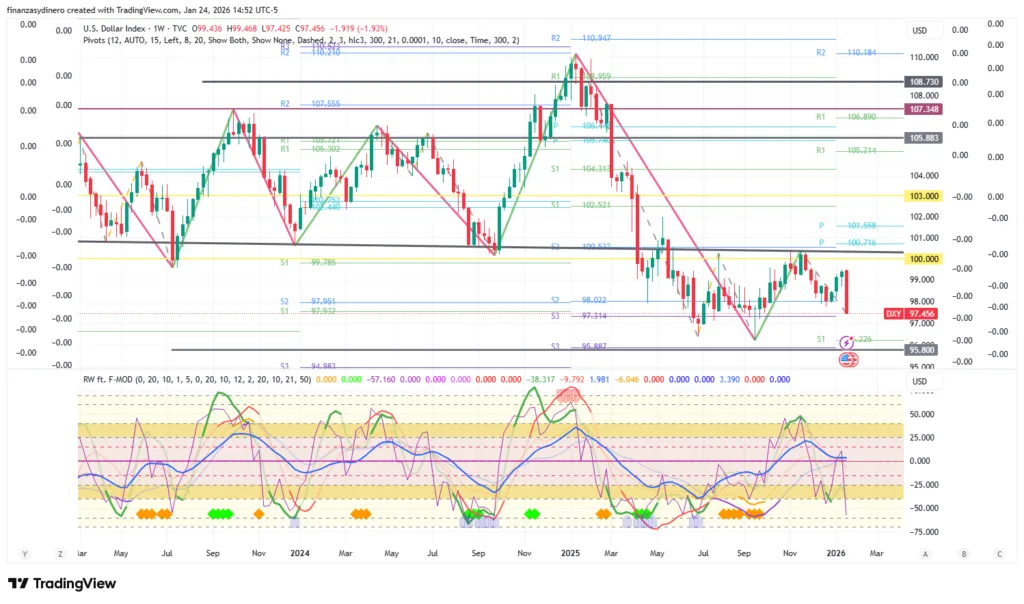 El DXY cierra una semana de fuertes perdidas luego de una semana de alta incertidumbre y volatilidad geopolítica y comercial. Soporte importante en el doble piso alrededor de los 97.