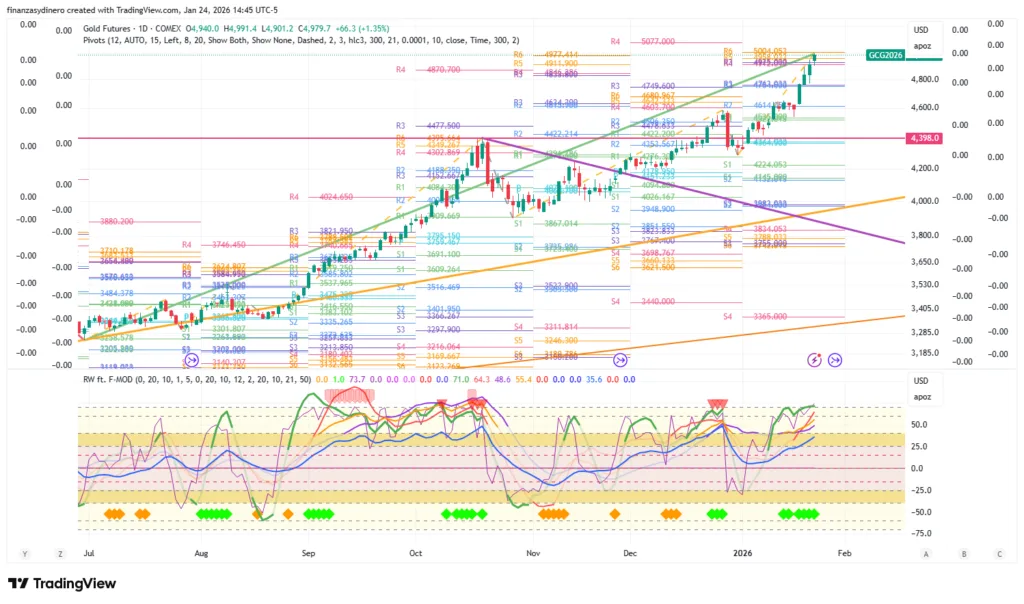 Cierra una semana de fuertes ganancias, marca un nuevo ATH y alcanza el objetivo alcista $4,654. Aumento considerable de los riesgos geopolíticos y comerciales a nivel mundial apoyan el oro como refugio.