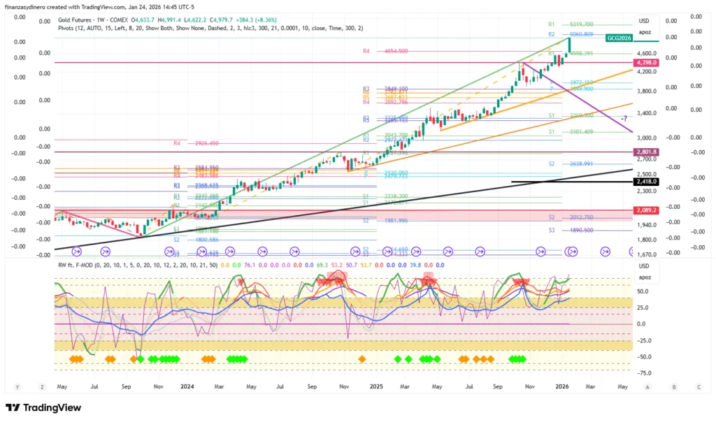 - Oro: Nuevo máximo histórico en sobrecompra extrema. Divergencias negativas sugieren alto riesgo de corrección fuerte en el mediano y largo plazo.
