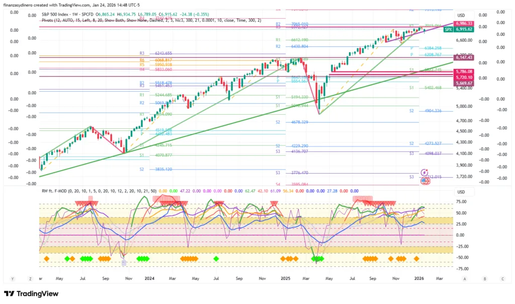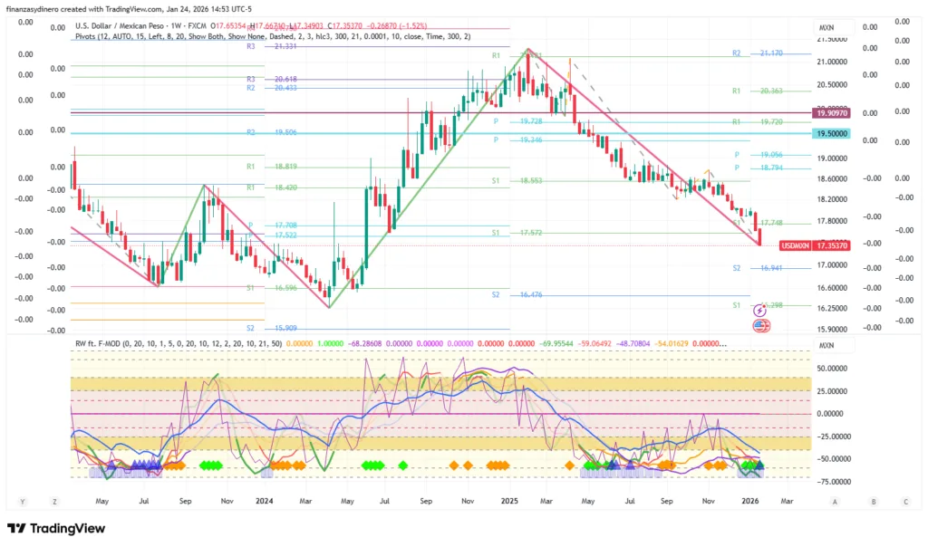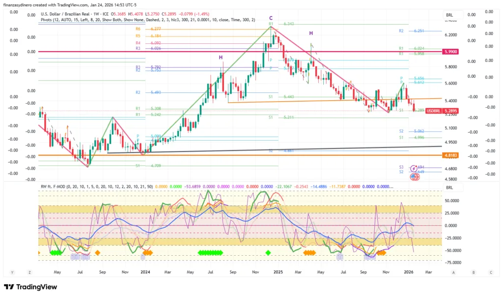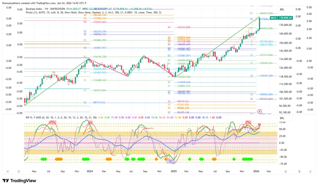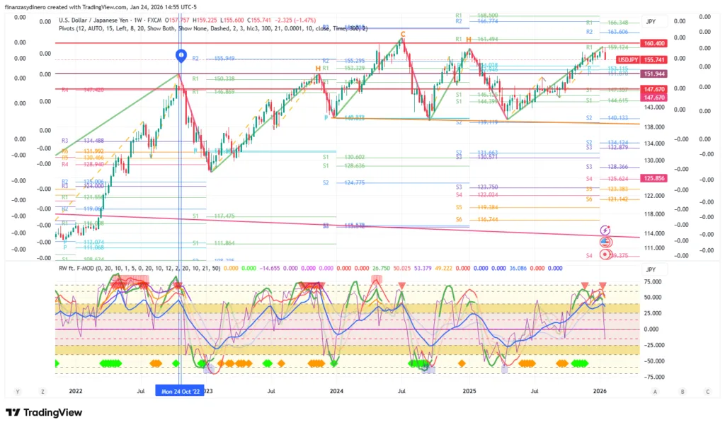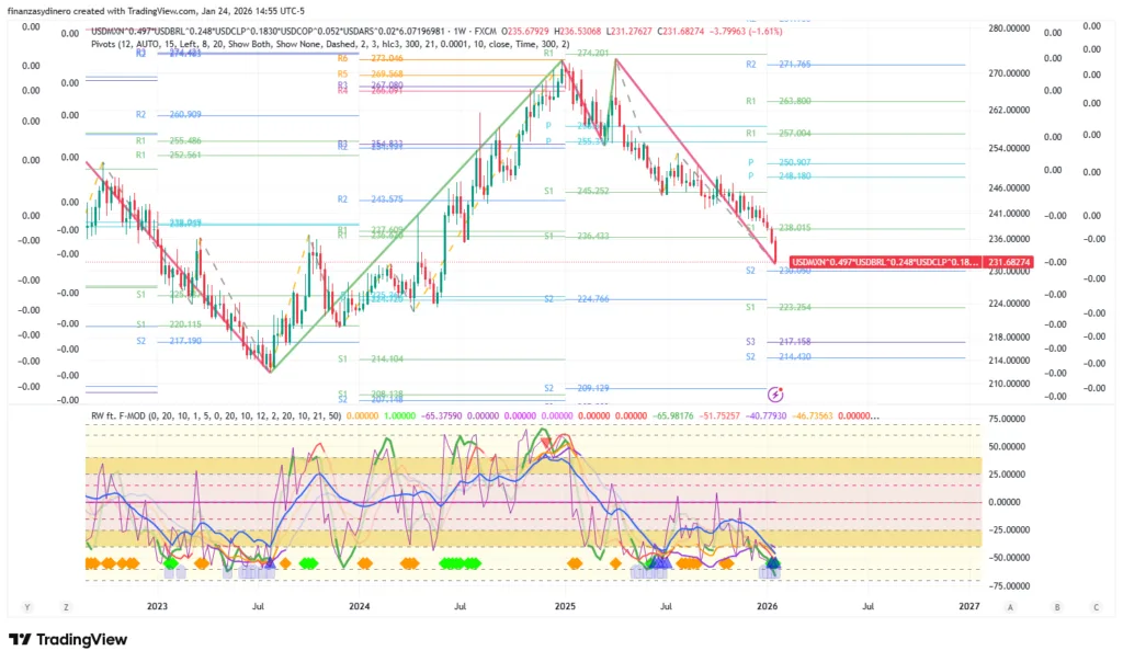 A nivel global, el dólar estadounidense (DXY) presenta fuertes caídas semanales, pero comienza a formar una base de largo plazo similar a episodios históricos previos a recuperaciones relevantes. En Asia, el yuan chino y el yen japonés operan en niveles técnicos críticos, mientras que en commodities el oro alcanza nuevos máximos históricos en un contexto de fuerte incertidumbre geopolítica y comercial, y el petróleo Brent se ve sostenido por disrupciones de oferta y tensiones internacionales.