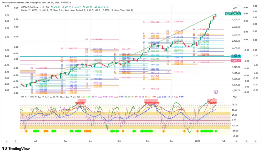 Los mercados financieros atraviesan una fase de alta tensión técnica y macroeconómica. En el frente cambiario, el peso colombiano, el chileno, el mexicano y el real brasileño registran desempeños destacados frente al dólar, aunque la mayoría de los cruces se ubican en zonas de sobreventa extrema, elevando el riesgo de correcciones alcistas en el corto y mediano plazo. El índice de monedas latinoamericanas refuerza esta lectura al mostrar divergencias positivas que podrían anticipar una depreciación promedio regional.