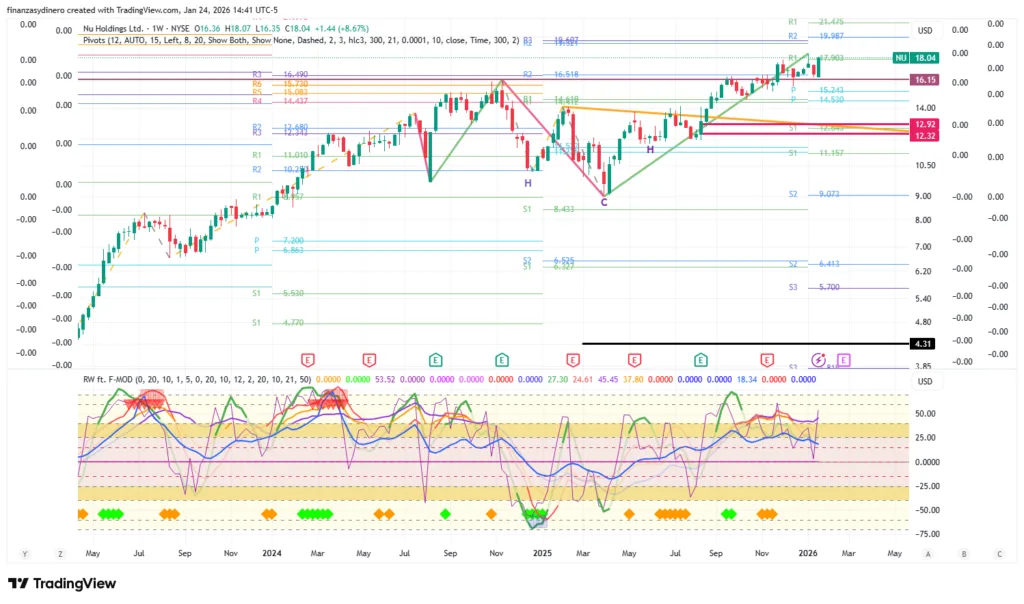 Cierra una semana de fuertes ganancias y se acerca a máximos históricos. Siguiente resistencia: $19.32 y soporte en zona $16.15-$16.51.