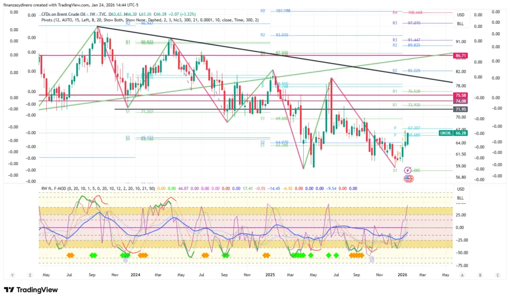 El Brent cierra una semana de fuertes ganancias e ingresa a la zona de resistencia dada por los pivotes anuales $65.68/$67.30.