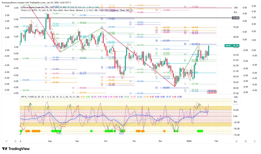 - Petróleo Brent: Impulsado por tensiones geopolíticas, restricciones de oferta y riesgos en Irán, Venezuela, Rusia y Kazajistán. Sesgo alcista de corto plazo, pero estructura mensual aún bajista.