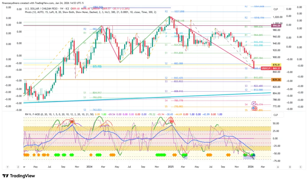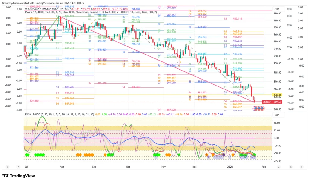 Cierra una semana de perdidas y alcanza mínimos que no se veían desde diciembre de 2023. Esta probando la zona de soporte $868/$889. El cobre permanece cerca de máximos multianuales y debe seguir apoyando el peso chileno.