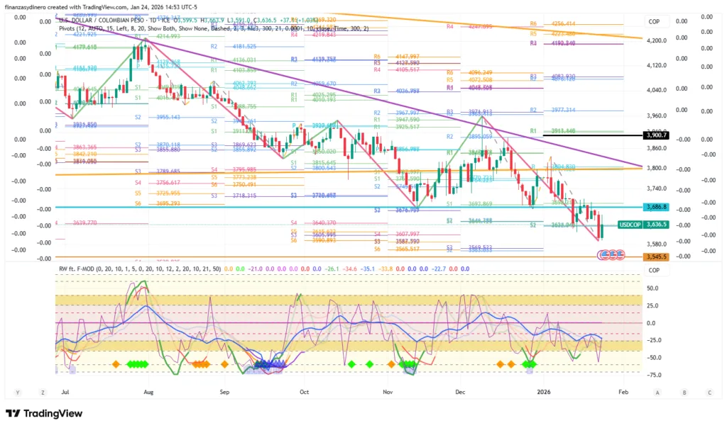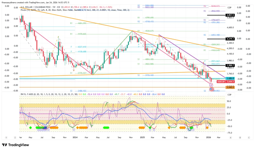 El USD/COP cierra una semana de perdidas y supera el soporte dado por los $3,686, nivel que ha sido probado desde mediados de noviembre de 2025. De ser superado de forma sostenida la tasa de cambio tendría el camino libre a los $3,545.