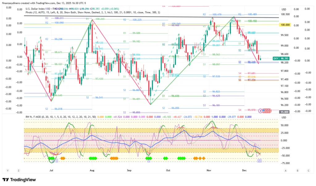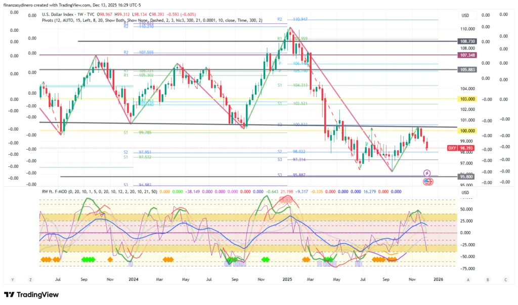 El DXY cierra una semana de perdidas y se encamina aprobar el soporte 98.02. La vela mensual para noviembre señala indecisión y podría implicar un caída en el mes de diciembre.