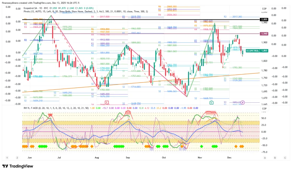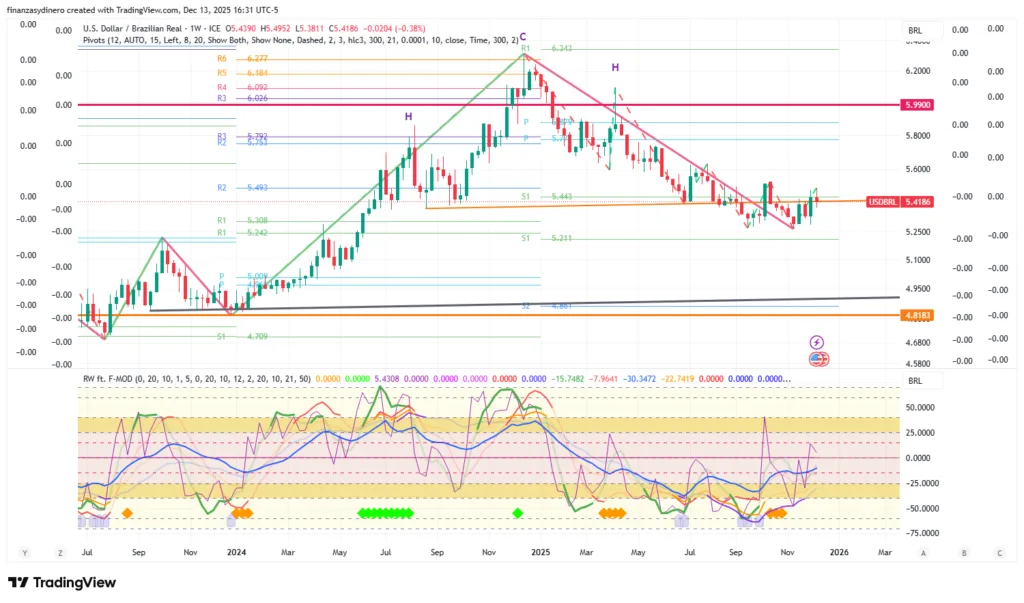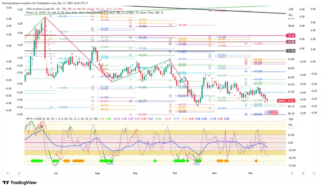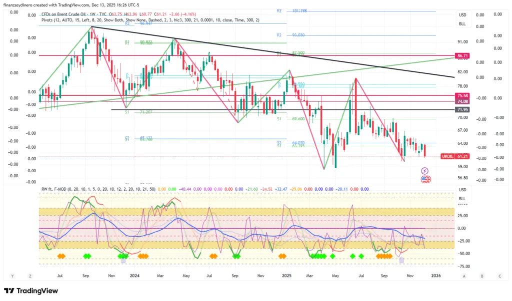 El Brent cierra una semana de fuertes perdidas luego de encontrar resistencia en la zona formada por los niveles S1 y S2 anuales. Mercado en la parte baja del rango de las ultimas semanas. Algunos actores del mercado esperan que en 2026 se presente una «super oferta» de petróleo en el mercado y una fuerte caída en el precio del crudo.
