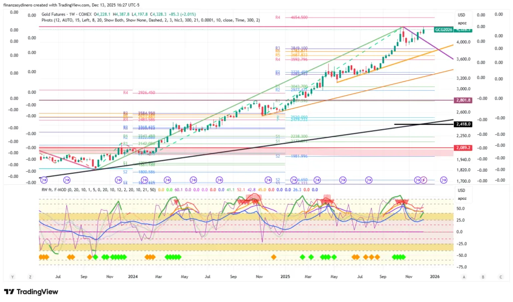 Cierra una semana de ganancias y se acerca al máximo histórico. En el mediano plazo objetivo alcista $4,654 y el objetivo bajista $3,735-$3,867.