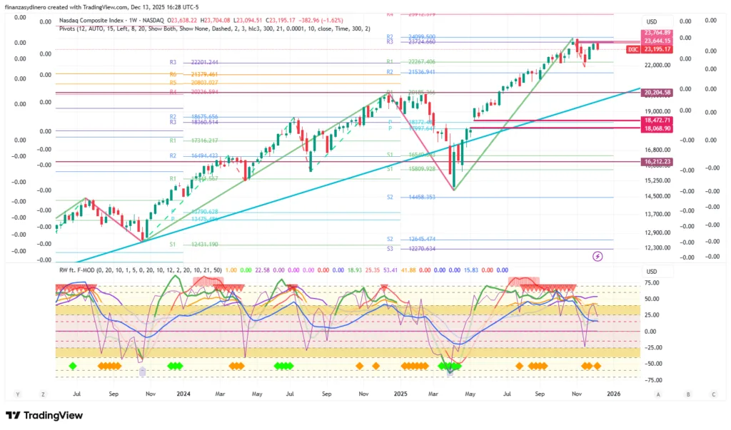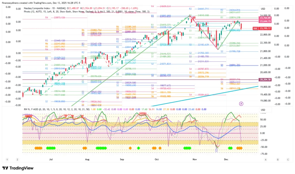 Cierra la semana con perdidas y encuentra resistencia en el gap bajista del 3-4 de noviembre entre los 23,764.87 y 23,644.15. Aumenta la atención sobre la burbuja-no-es-burbuja I.A.